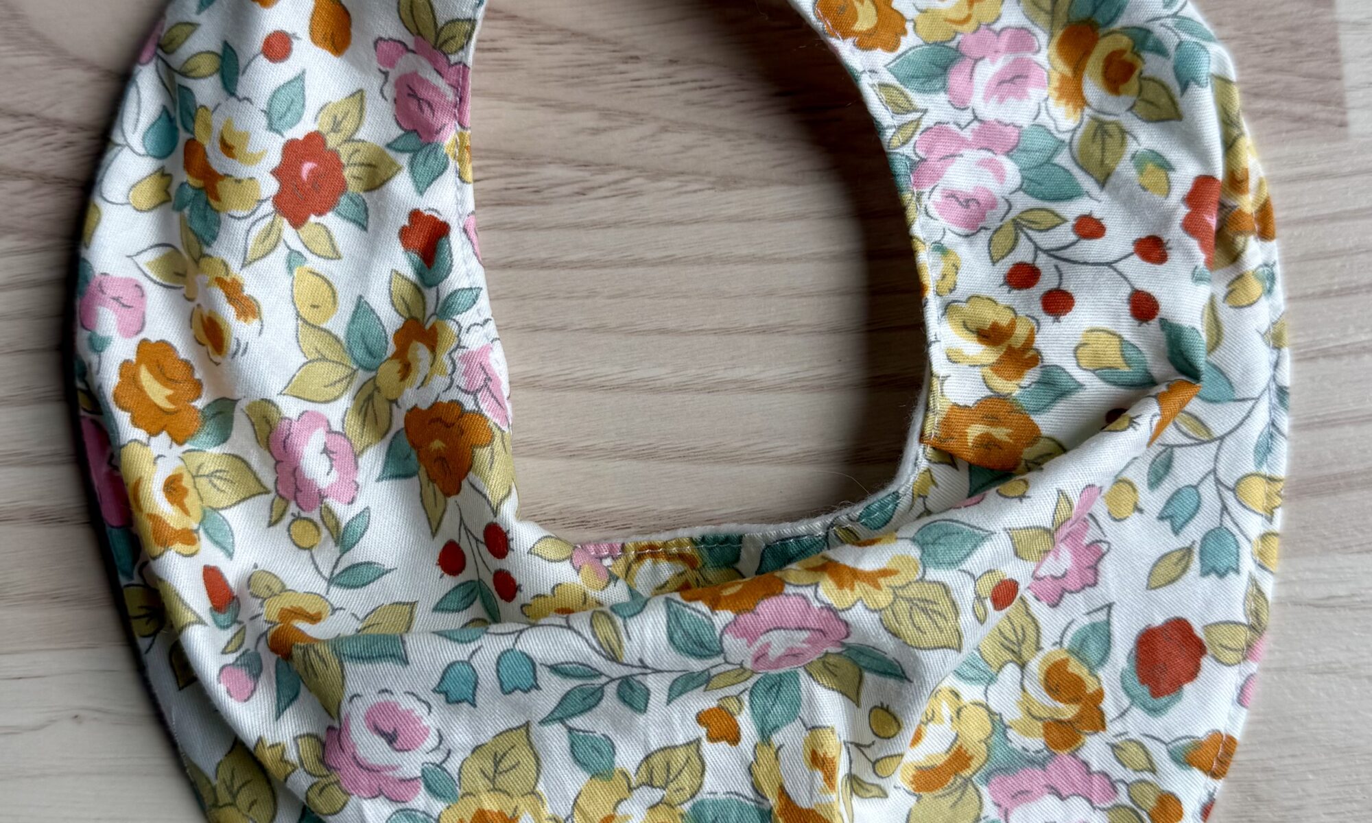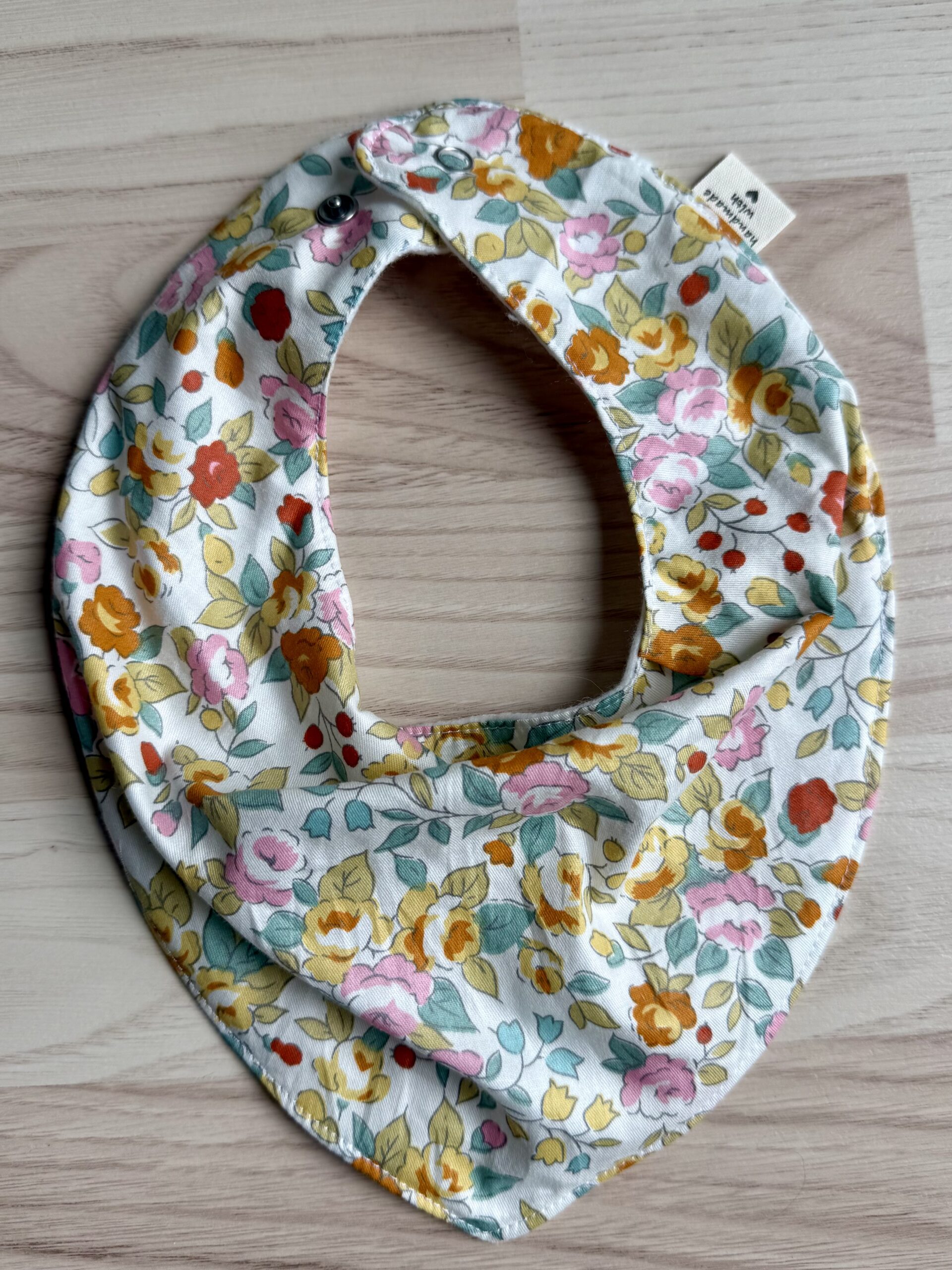 Savlesmæk i bandana-style til baby syet i nyt stof med fine blomster og hvid fleece på bagsiden. Med to tryklåse for nem tilpasning af størrelsen. Dejlig blød kvalitet.