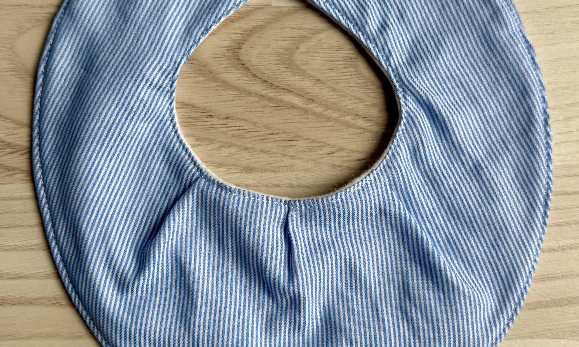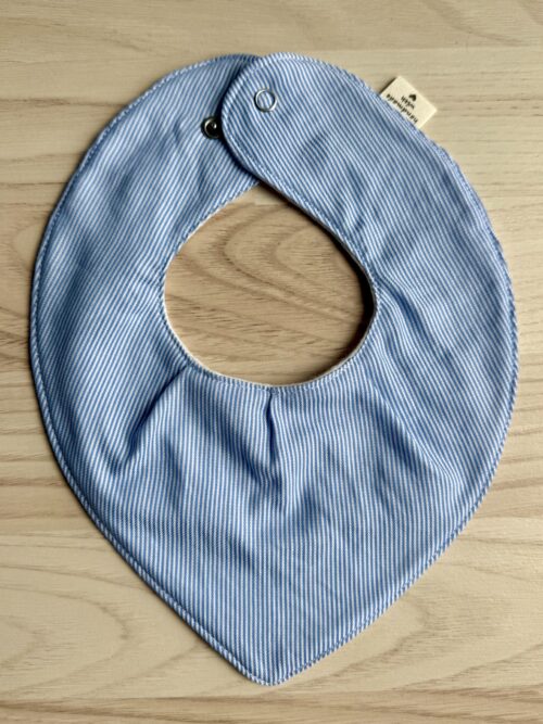 Savlesmæk til baby syet i lyseblåt stof med hvide striber. Syet i genbrugsstof og nyt hvid fleece på bagsiden. Med to tryklåse for nem tilpasning af størrelsen. Dejlig blød kvalitet.