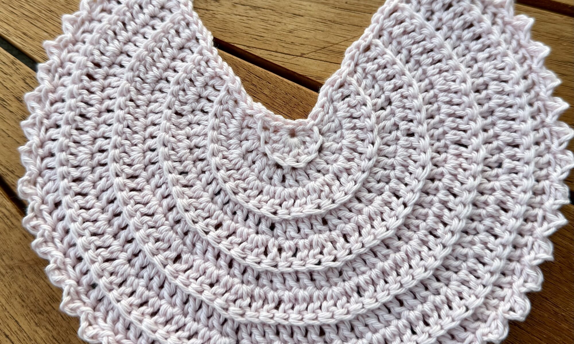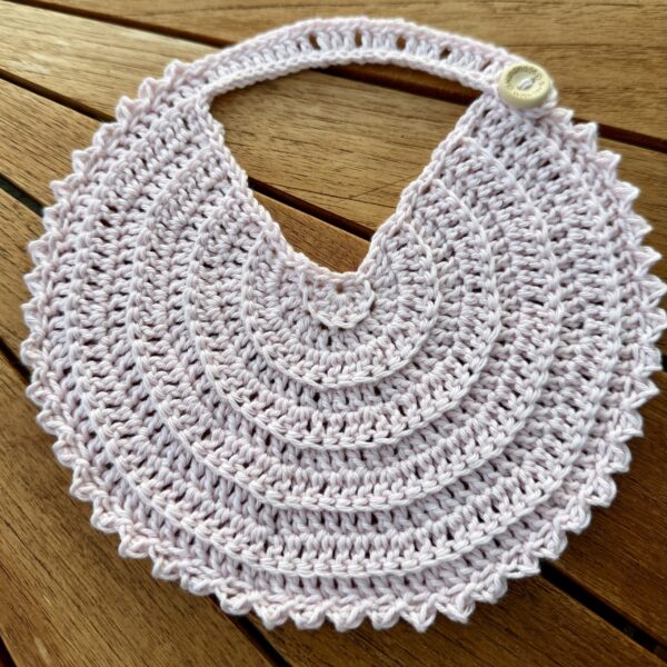 Den fineste savlessmæk til baby hæklet i 100 % bomuldsgarn. En flot sart baby lyserød farve.